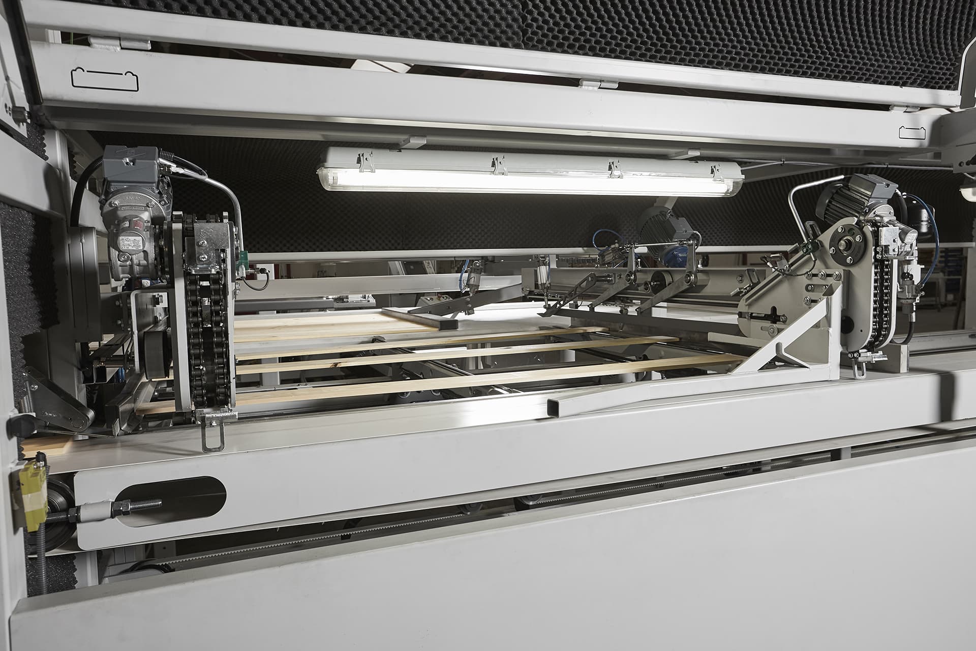 When the magazine is full, the timber is led to a feeding table in front of the press.