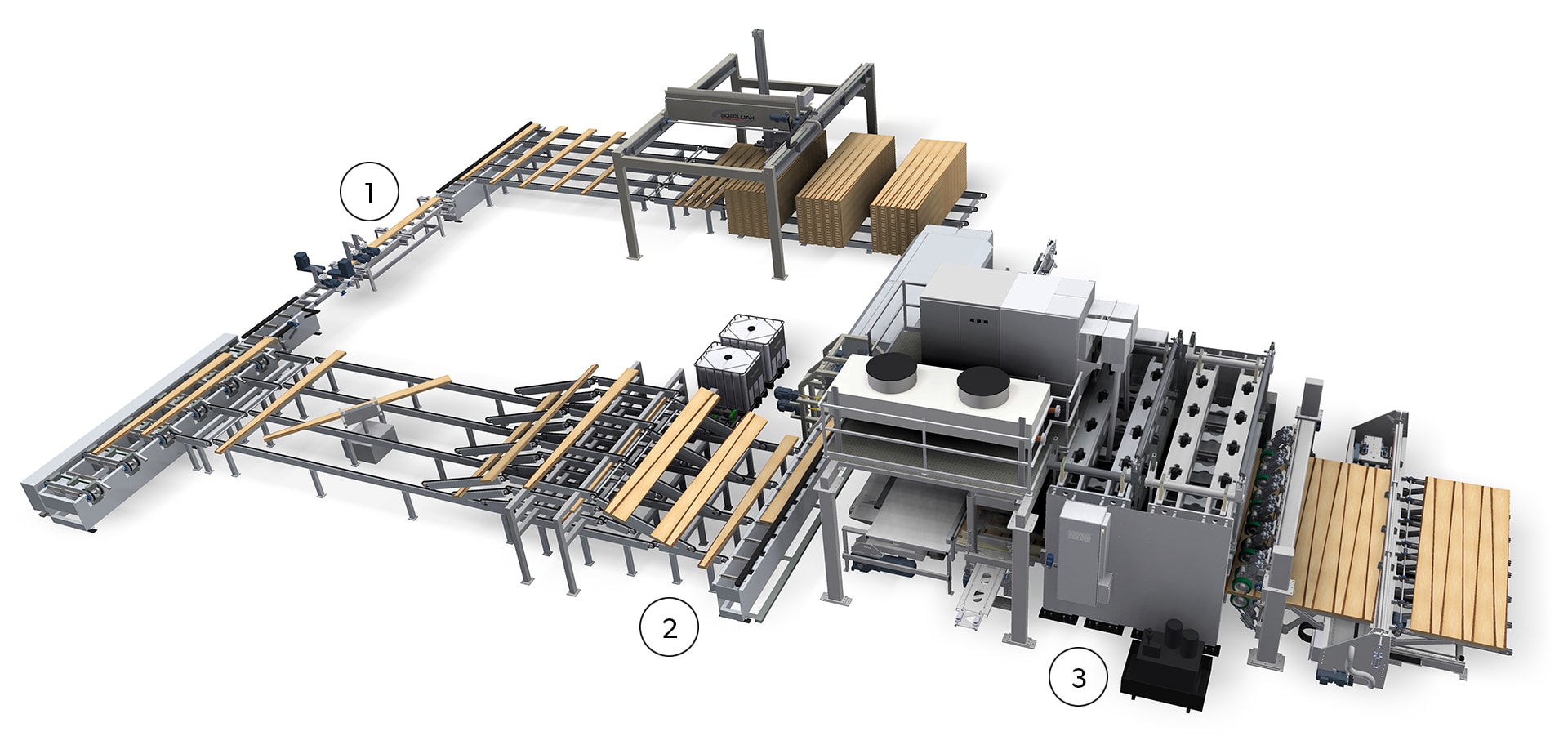 The system calculates in which order the sorted timber is transported to the glue applicator.