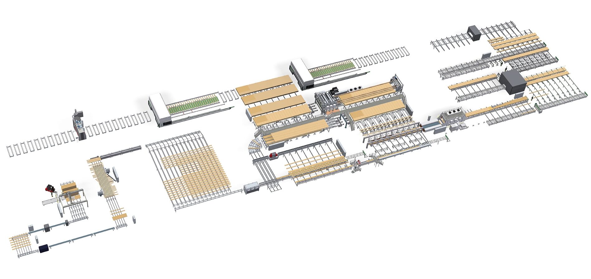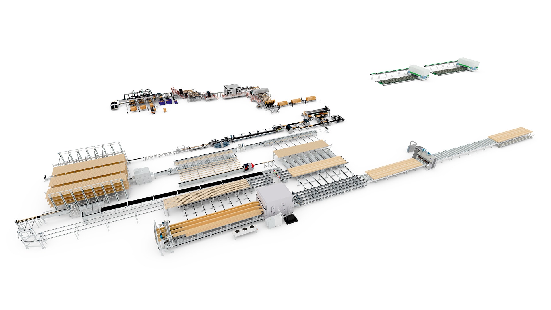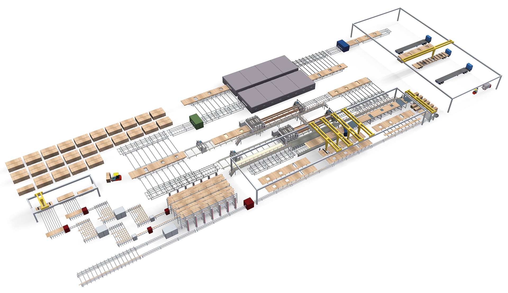 In this layout, both lines are equipped for finishing machinery: the beam line with a cross-cut saw, a planer, repair stations and wrapping equipment, the CLT-line with CNC machines and sanding machines.