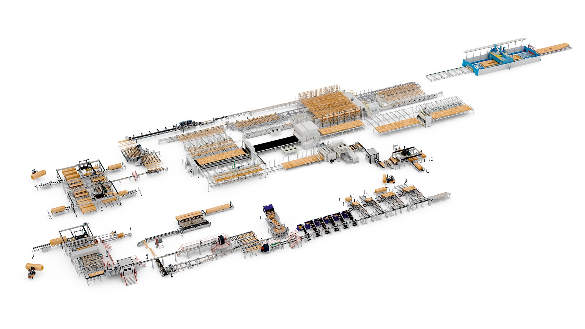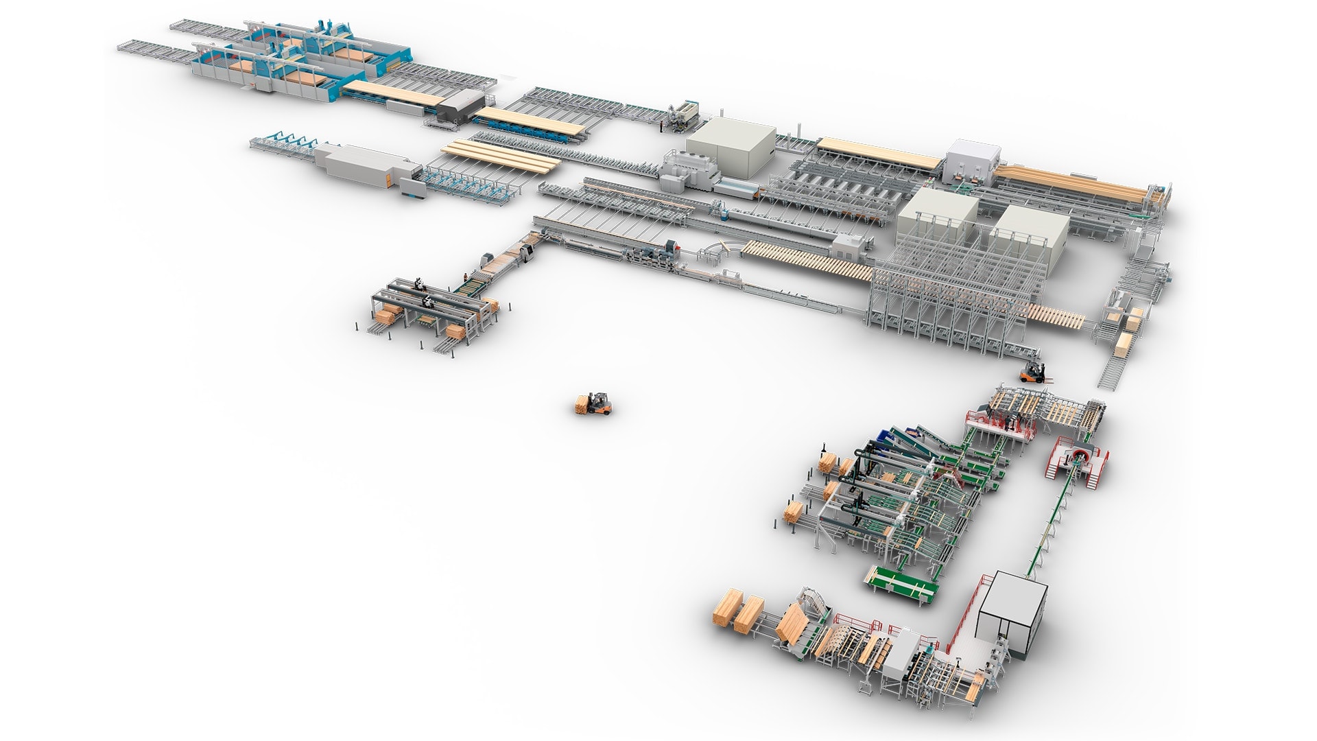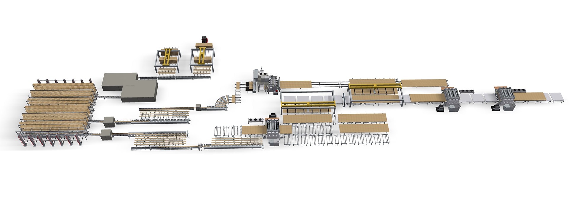 In this layout, both lines are equipped for finishing machinery: the beam line with a cross-cut saw, a planer, repair stations and wrapping equipment, the CLT-line with CNC machines and sanding machines.