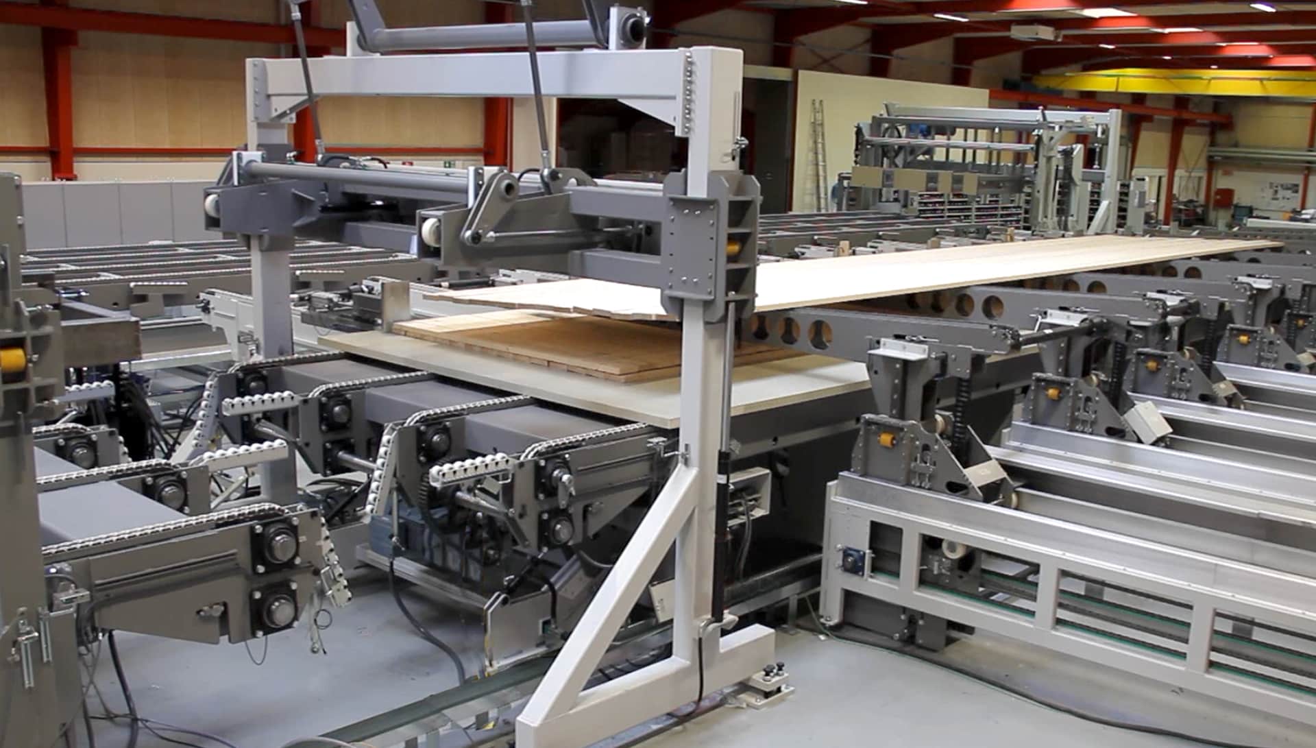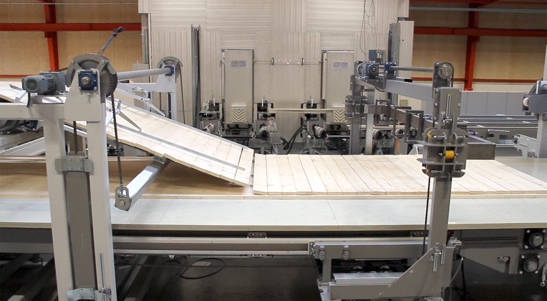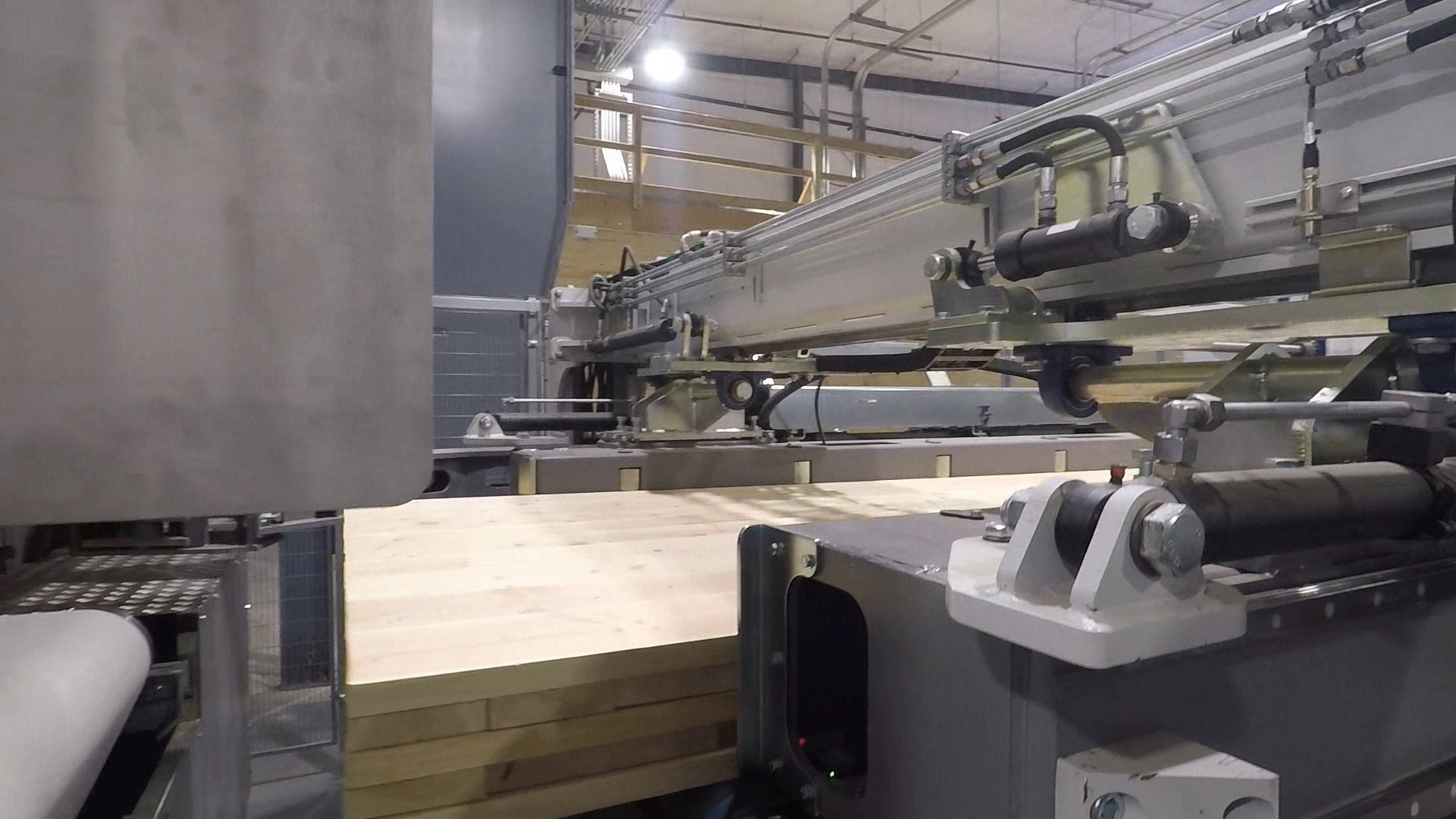 The lay-up system handles both beam lamstock, which is turned 90º, and CLT longitudinal lamstock, which is packed flat to form a layer.