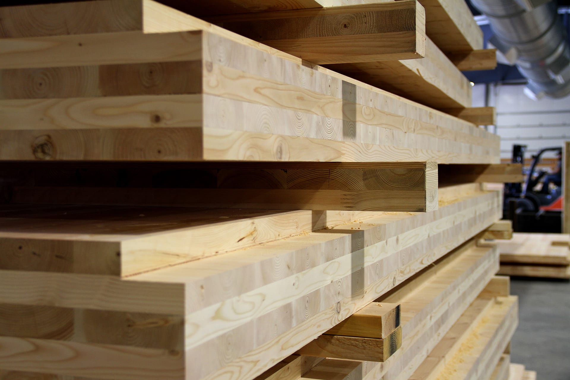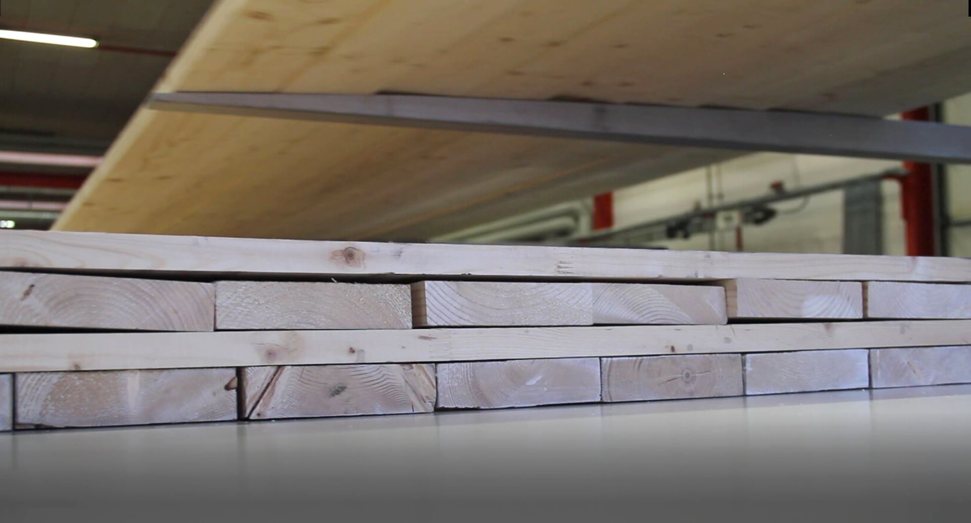 The lamstock is then distributed to the two lines where it is used for glulam beams, for lengthwise CLT-layers and (after having been cut) for crosswise CLT-layers.
